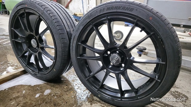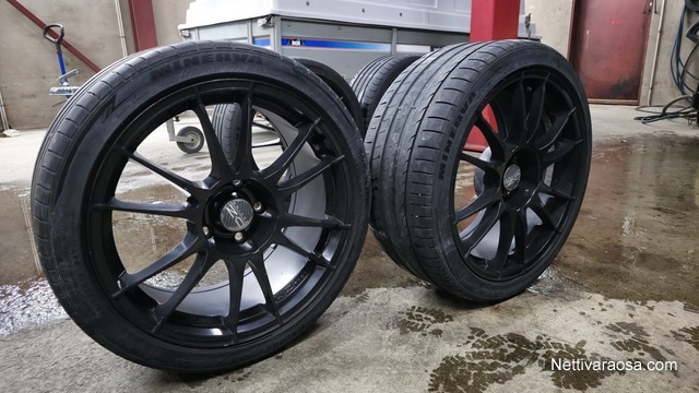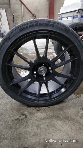 Koossa 18x8 ja 18x9 ET40. Päällä vaihtokunnossa olevat renkaat. Vanteiden kunto on hyvä, maalautettu mustaksi jokunen vuosi sitten. Keskireikä metallisilla sovitteilla.